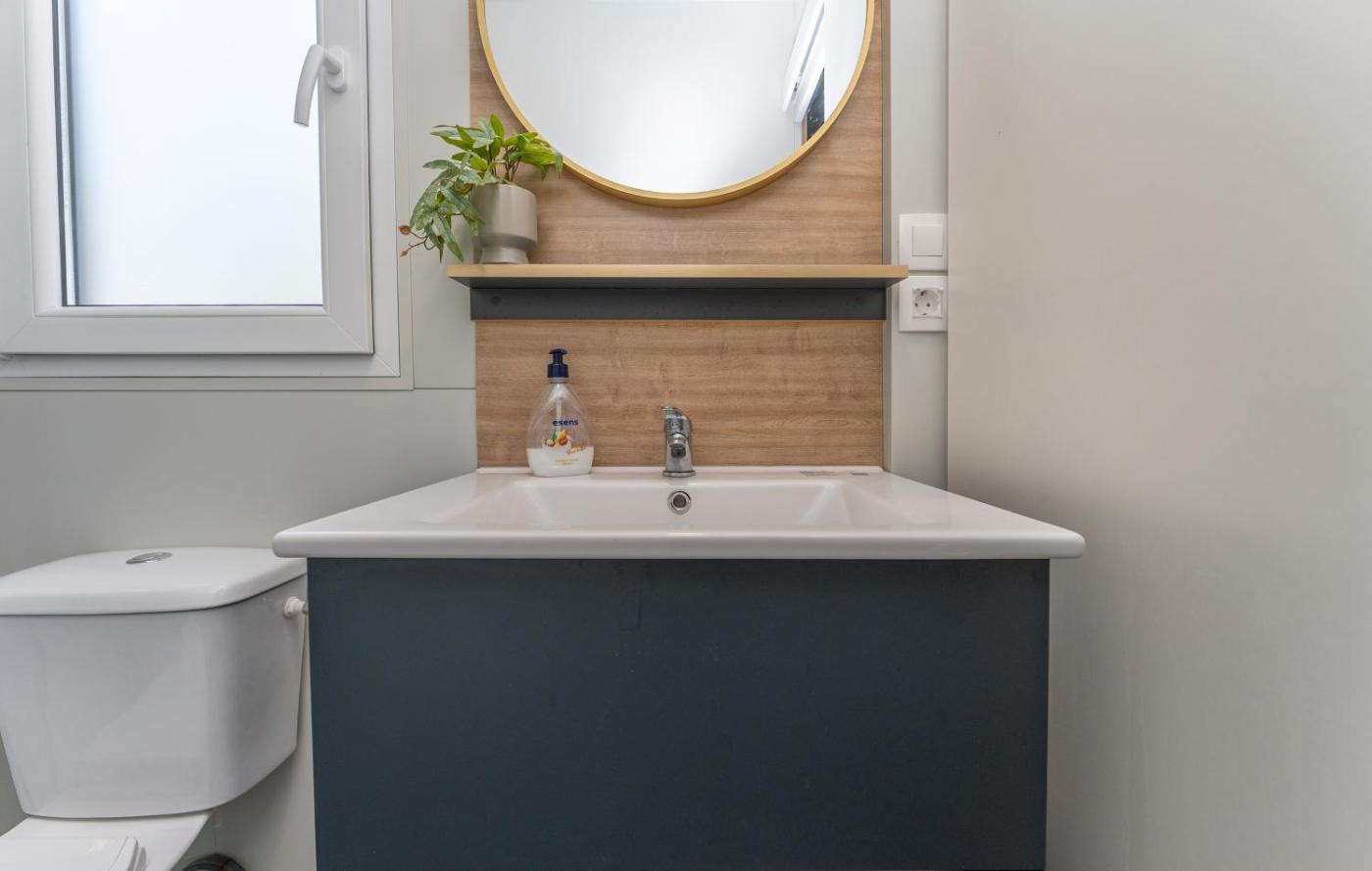 Mobile Home. This air-conditioned mobile home includes 1 living room, 2 separate bedrooms and 1 bathroom with a shower. This mobile home has a seating area, a dining area, a flat-screen TV and an outdoor dining area. The unit has 3 beds.