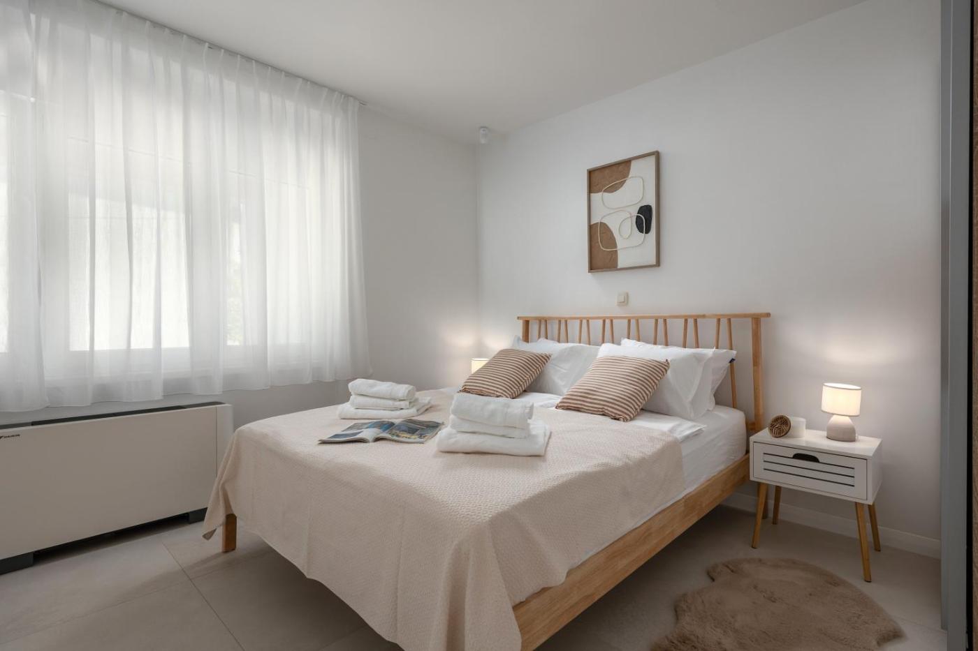 One-Bedroom Apartment with Garden. The air-conditioned apartment features 1 bedroom and 1 bathroom with a shower and a hairdryer. Guests will find a stovetop, a refrigerator, kitchenware and an oven in the fully equipped kitchen. The apartment also provides guests with a barbecue. Featuring a terrace, this apartment also provides a coffee machine, a seating area and a flat-screen TV. The unit offers 2 beds. ;