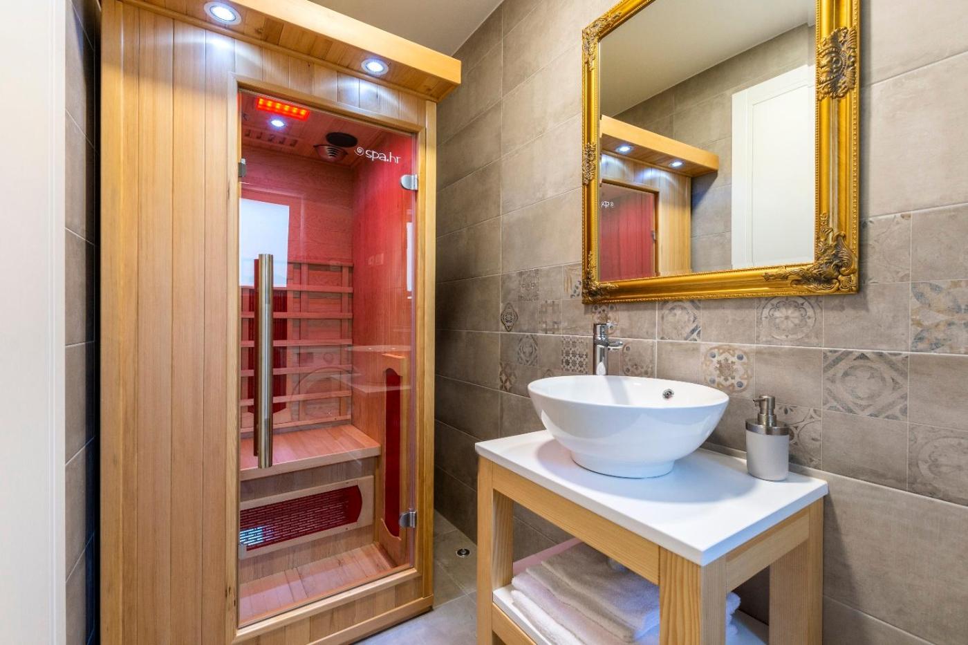 Three-Bedroom Apartment. This apartments standout features are the hot tub, spa bath and sauna. Featuring a private entrance, this spacious apartment also is comprised of 1 living room, 3 separate bedrooms and 4 bathrooms with a walk-in shower. Guests will find a stovetop, a refrigerator, a dishwasher and kitchenware in the well-fitted kitchen. The apartment also has a barbecue. The air-conditioned apartment offers a flat-screen TV with cable channels, a washing machine, soundproof walls, a seating area as well as sea views. The unit offers 4 beds.