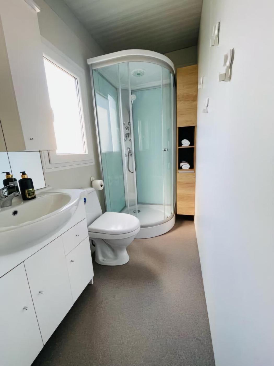 Mobile Home. This mobile home features 1 living room, 2 separate bedrooms and 1 bathroom with a shower and free toiletries. Guests will find a stovetop, a refrigerator, a dishwasher and kitchenware in the kitchen. The mobile home also comes with a barbecue. This air-conditioned mobile home consists of a dining area, a flat-screen TV with streaming services a seating area and a terrace. The unit has 3 beds.
