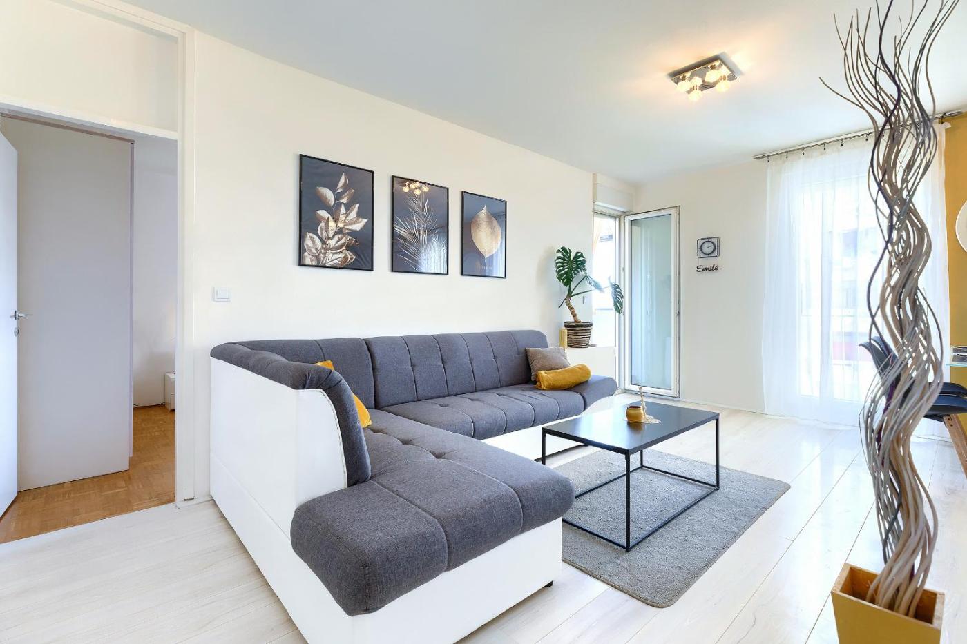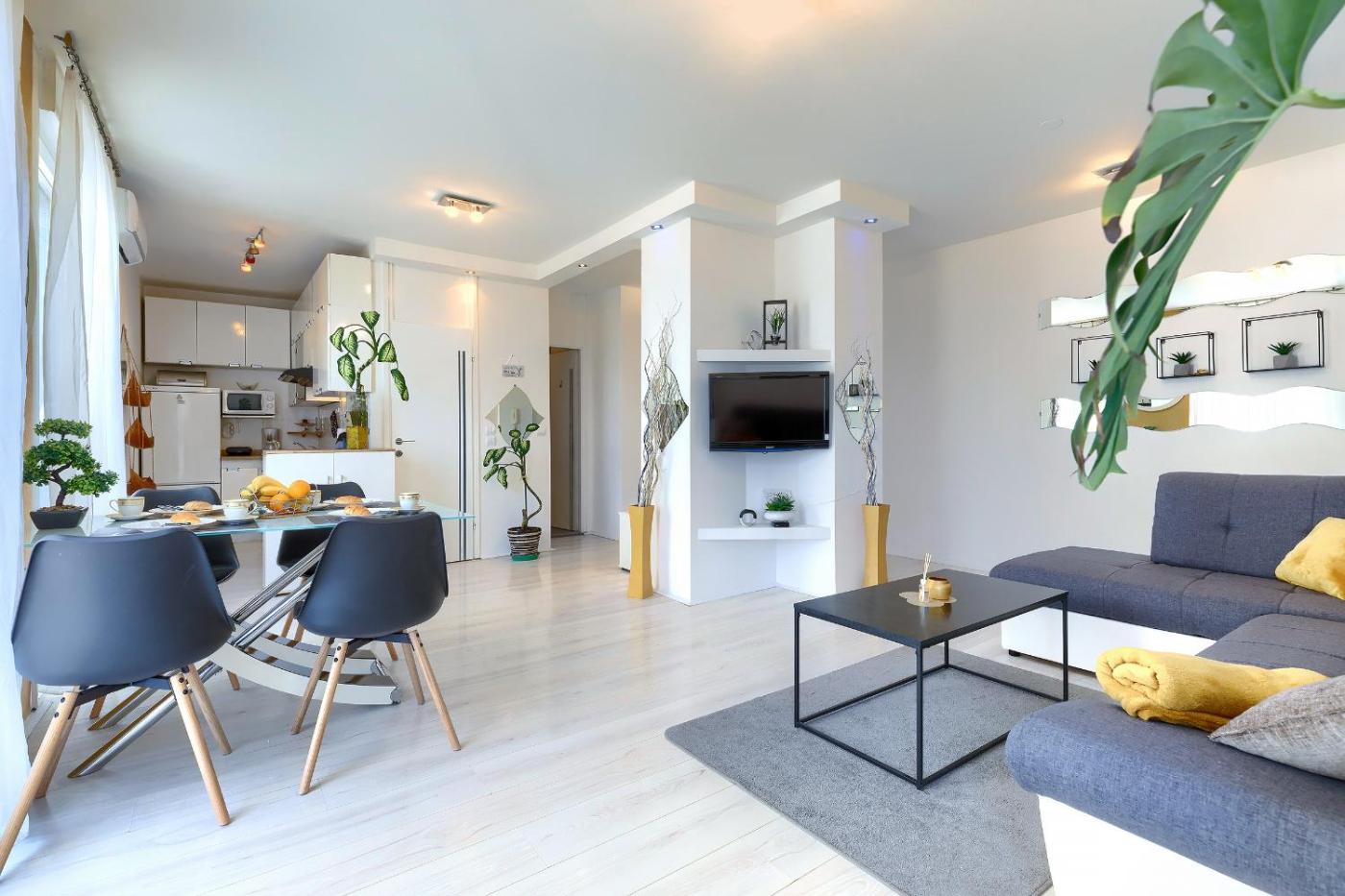 One-Bedroom Apartment. This apartment comprises 1 living room, 1 separate bedroom and 1 bathroom with a bath and free toiletries. Guests can make meals in the kitchen that comes with a stovetop, a refrigerator, kitchenware and an oven. This apartment is air-conditioned and features a seating area with a flat-screen TV, a washing machine, soundproof walls, a tea and coffee maker, as well as a dining area. The unit offers 2 beds.