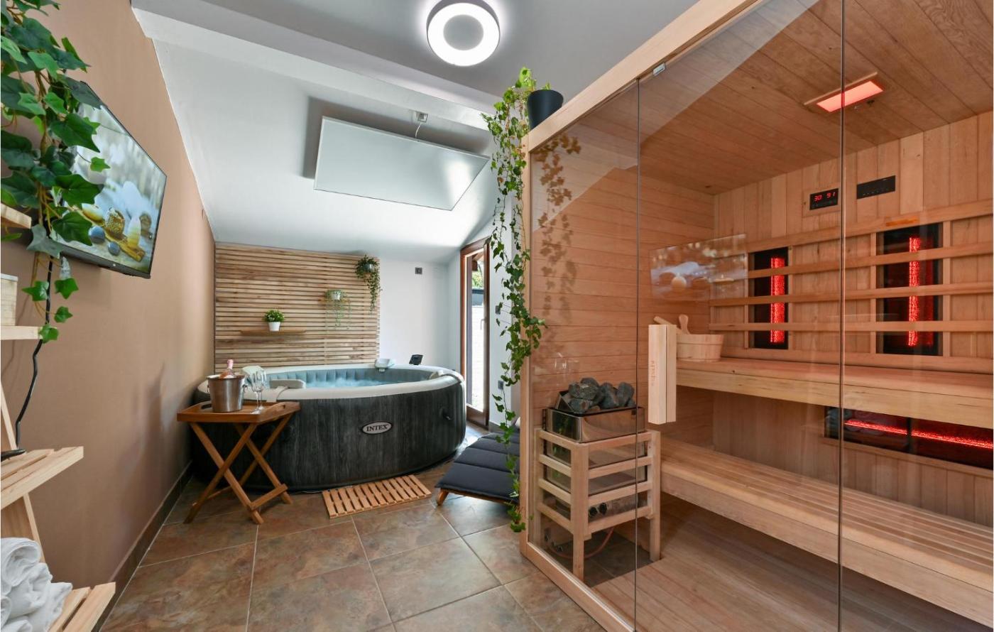 Two-Bedroom Holiday Home. Guests will have a special experience as this holiday home offers a private pool, a hot tub and a sauna. Featuring a private entrance, this air-conditioned holiday home comprises 1 living room, 2 separate bedrooms and 1 bathroom with a shower and a hairdryer. Meals can be prepared in the kitchen, which is equipped with a refrigerator, a dishwasher, kitchenware and an oven. The spacious holiday home provides a washing machine, a tea and coffee maker, a dining area, a barbecue and a TV with streaming services. The unit offers 3 beds and 1 futon.