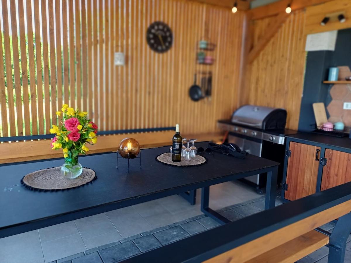 The holiday home with a terrace and garden views features 1 bedroom, a living room, a flat-screen TV, an equipped kitchen with a dishwasher and an oven, and 2 bathrooms with a hot tub. Towels and bed linen are provided in the holiday home. There is also a seating area and a fireplace.